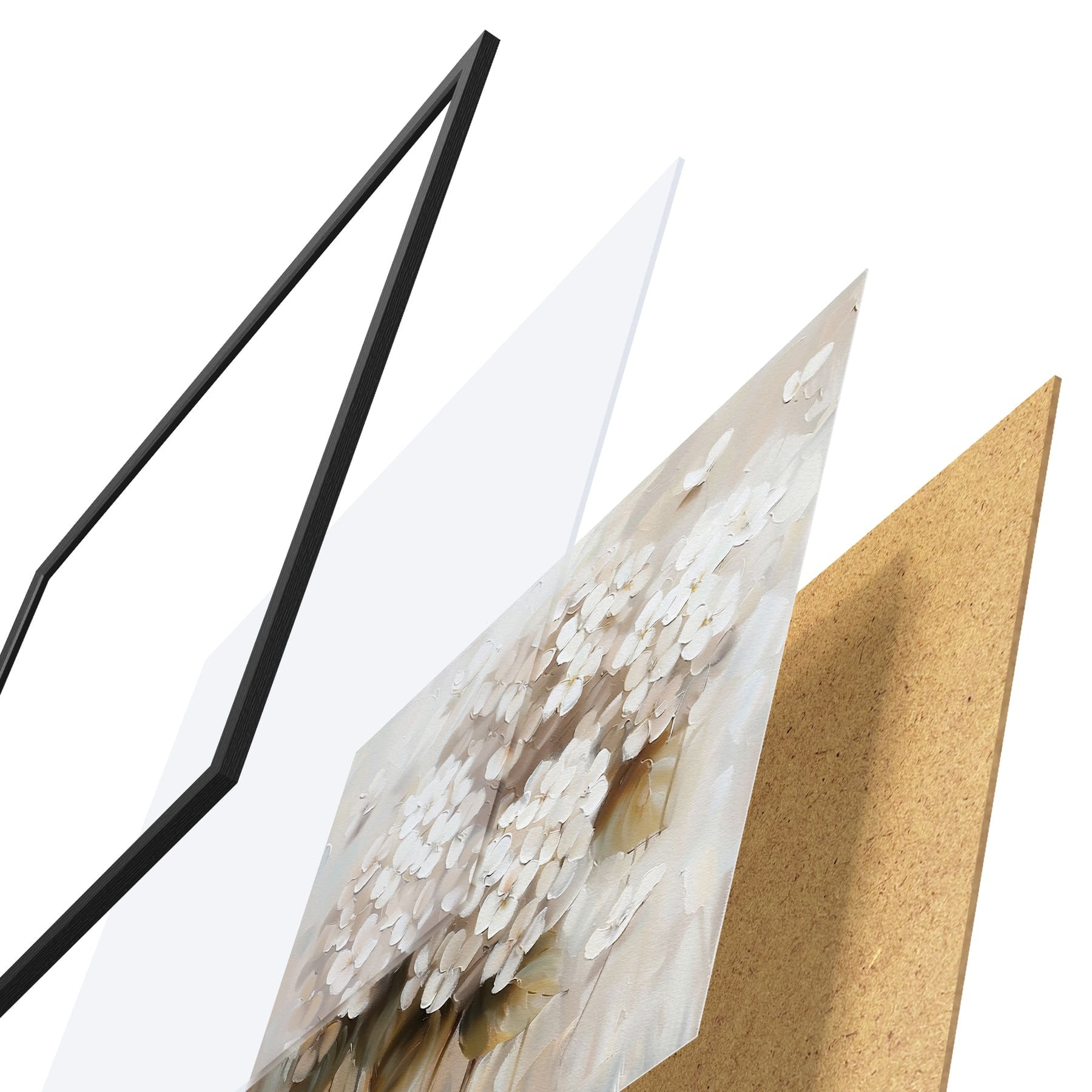 Das Poster besteht aus einem Rahmen, Plexiglas, einem gedruckten Bild und einer Rückwand aus Spanplatten. Dank der Halterungen auf der Rückseite kann das Poster sofort an die Wand gehängt werden.