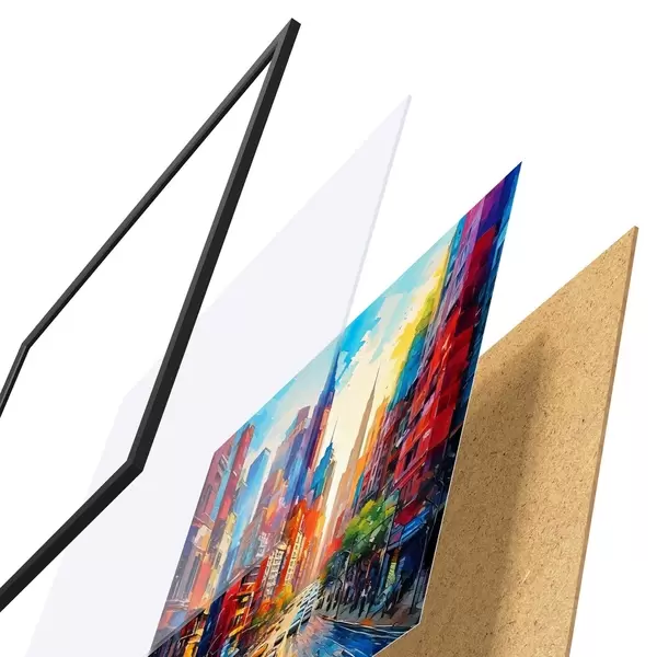 Das Poster besteht aus einem Rahmen, Plexiglas, einem gedruckten Bild und einer Rückwand aus Spanplatten. Dank der Halterungen auf der Rückseite kann das Poster sofort an die Wand gehängt werden.