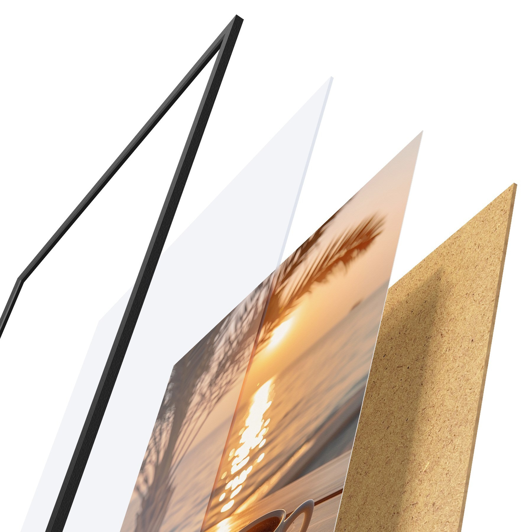 Das Poster besteht aus einem Rahmen, Plexiglas, einem gedruckten Bild und einer Rückwand aus Spanplatten. Dank der Halterungen auf der Rückseite kann das Poster sofort an die Wand gehängt werden.