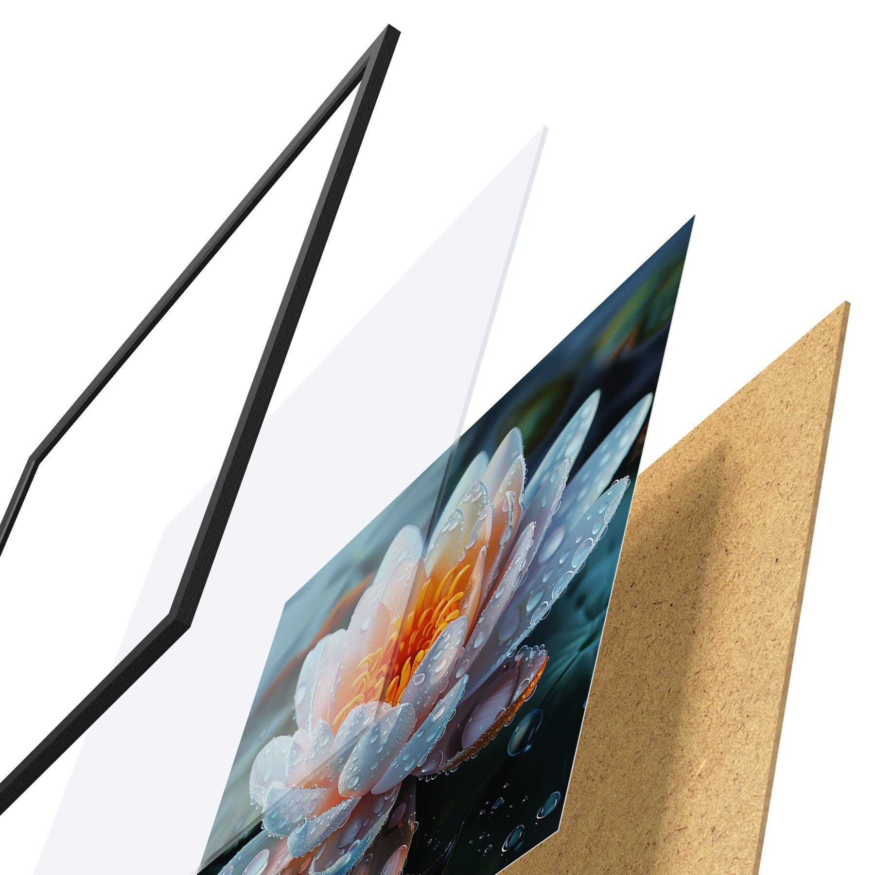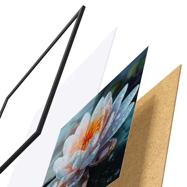 Das Poster besteht aus einem Rahmen, Plexiglas, einem gedruckten Bild und einer Rückwand aus Spanplatten. Dank der Halterungen auf der Rückseite kann das Poster sofort an die Wand gehängt werden.