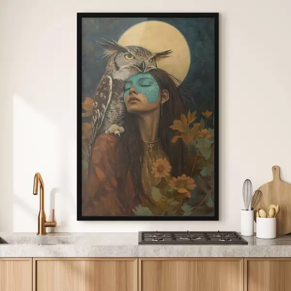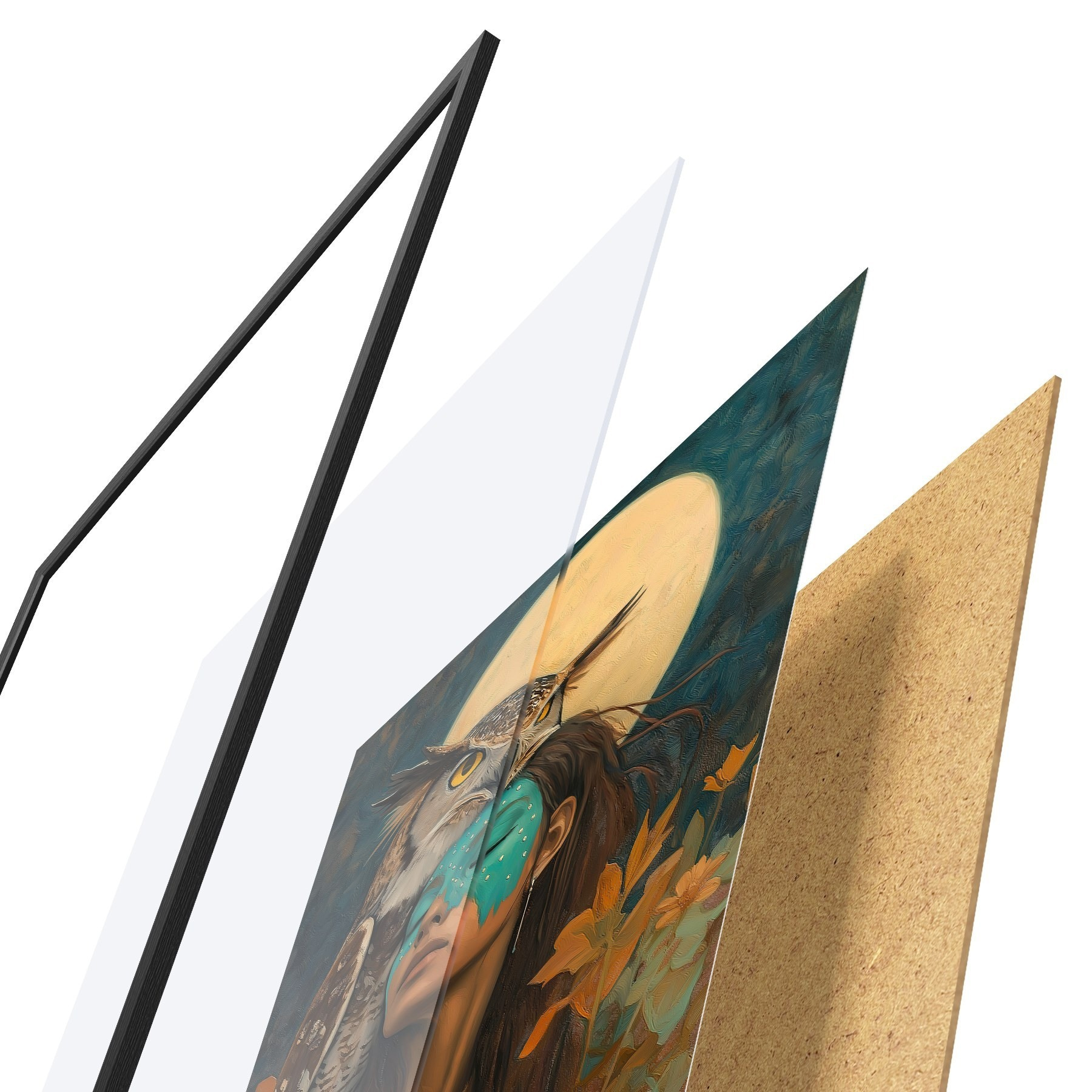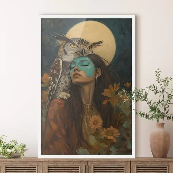 Poster Frau mit Eule, Tribal-Stil, Vollmond, Blumen f41444