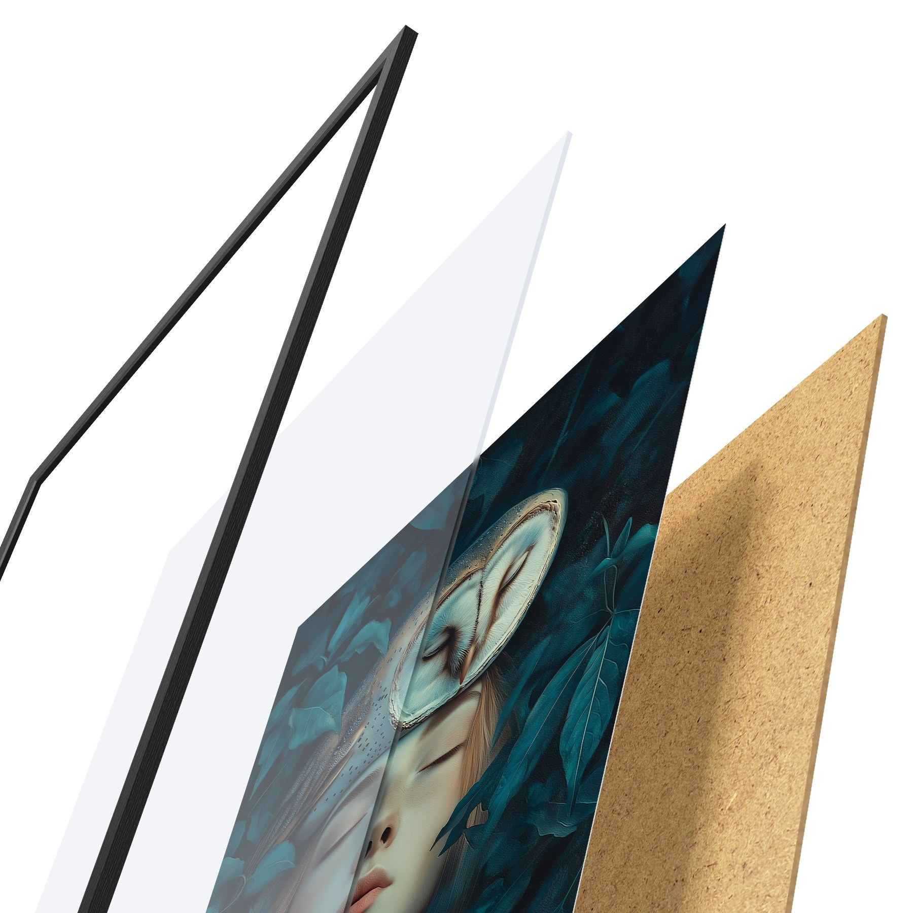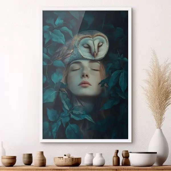 Poster Frau mit Eule in den grünen Blättern, friedlich, Natur Nr f41445