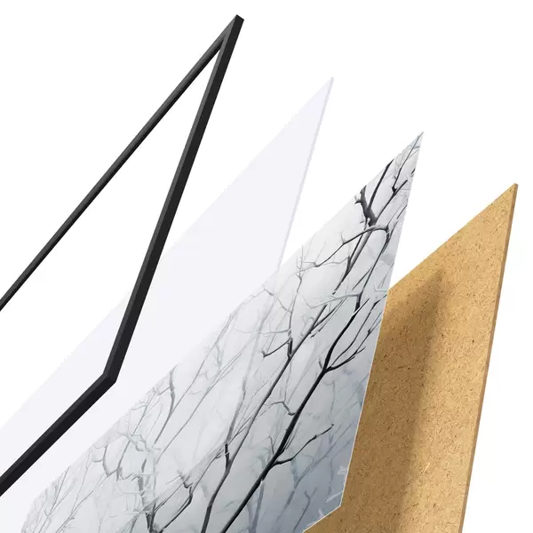 Das Poster besteht aus einem Rahmen, Plexiglas, einem gedruckten Bild und einer Rückwand aus Spanplatten. Dank der Halterungen auf der Rückseite kann das Poster sofort an die Wand gehängt werden.
