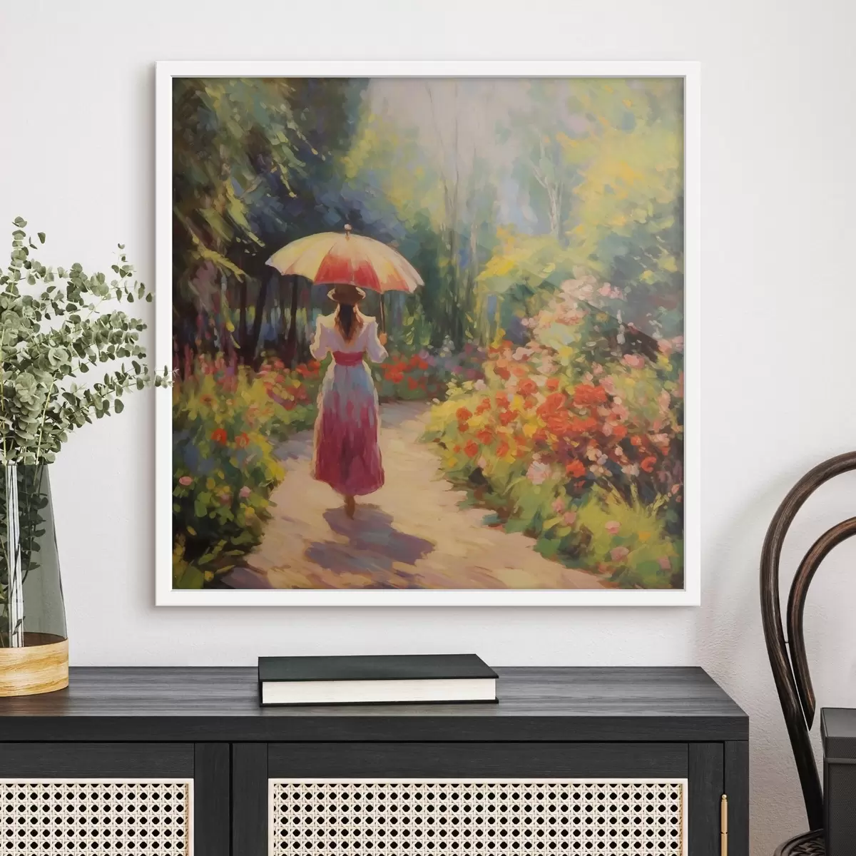 Poster Dame mit Regenschirm in einem blühenden Garten Nr f41495