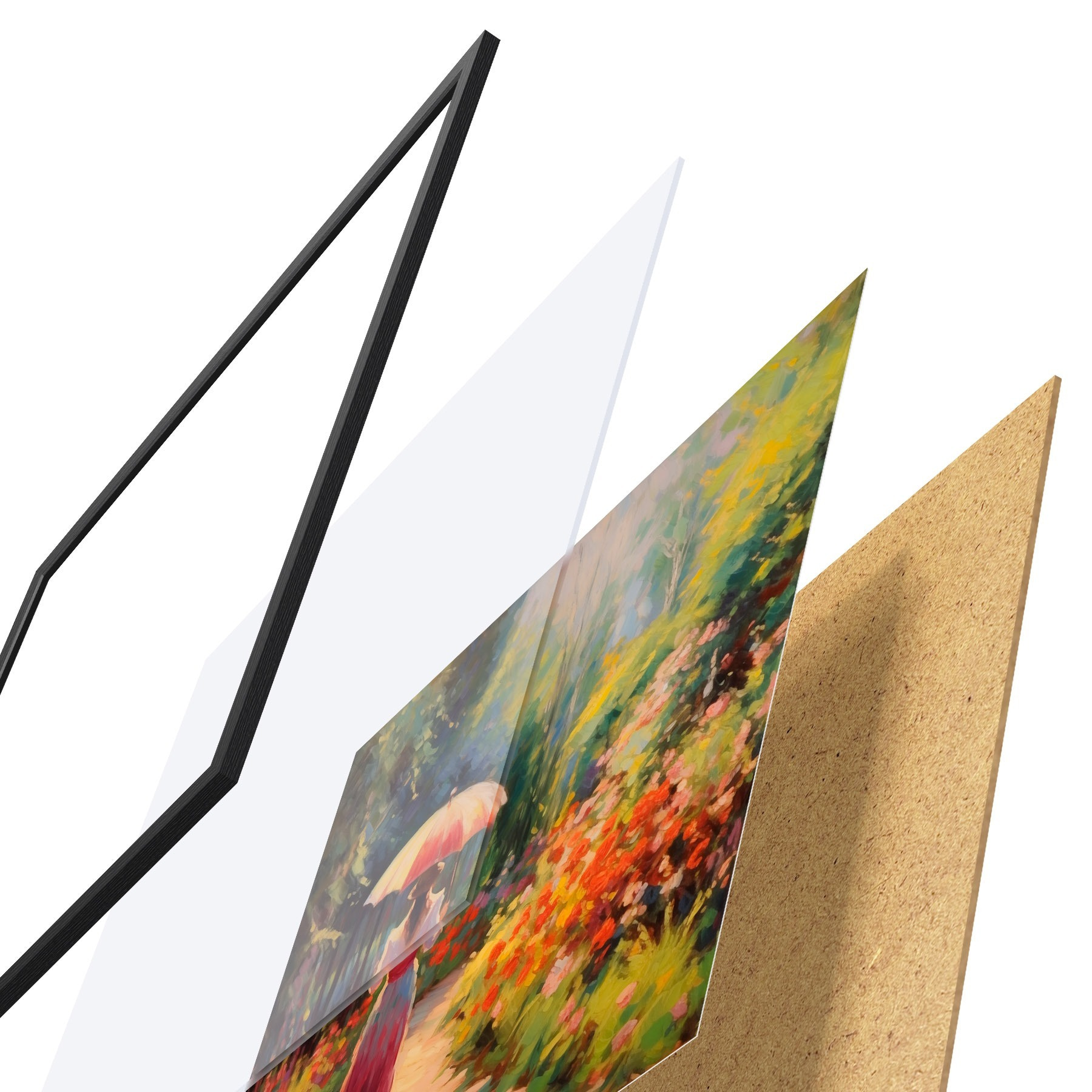 Das Poster besteht aus einem Rahmen, Plexiglas, einem gedruckten Bild und einer Rückwand aus Spanplatten. Dank der Halterungen auf der Rückseite kann das Poster sofort an die Wand gehängt werden.