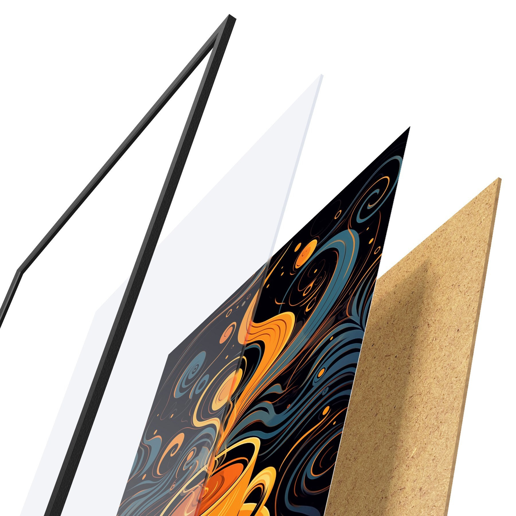 Das Poster besteht aus einem Rahmen, Plexiglas, einem gedruckten Bild und einer Rückwand aus Spanplatten. Dank der Halterungen auf der Rückseite kann das Poster sofort an die Wand gehängt werden.