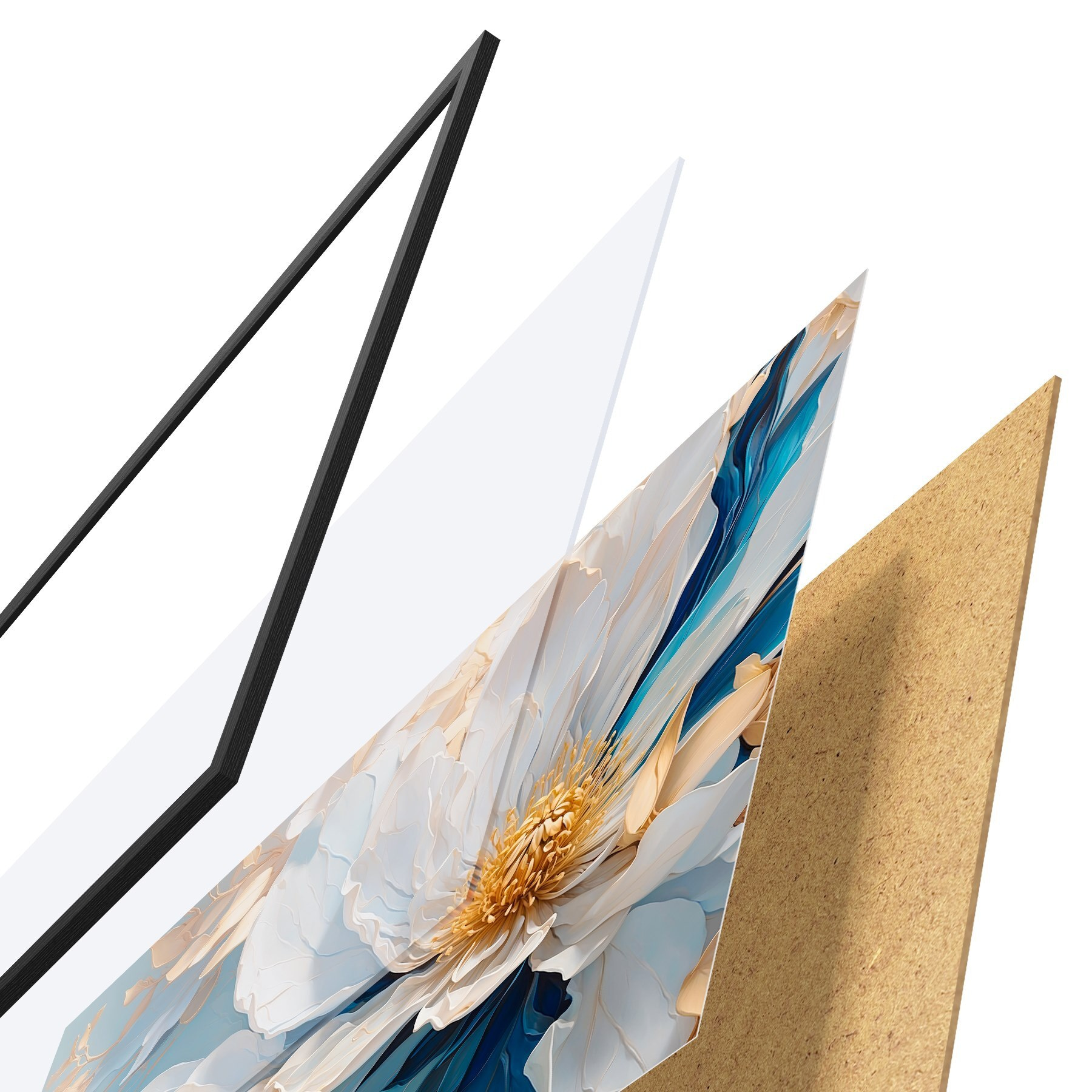 Das Poster besteht aus einem Rahmen, Plexiglas, einem gedruckten Bild und einer Rückwand aus Spanplatten. Dank der Halterungen auf der Rückseite kann das Poster sofort an die Wand gehängt werden.