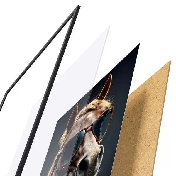 Das Poster besteht aus einem Rahmen, Plexiglas, einem gedruckten Bild und einer Rückwand aus Spanplatten. Dank der Halterungen auf der Rückseite kann das Poster sofort an die Wand gehängt werden.