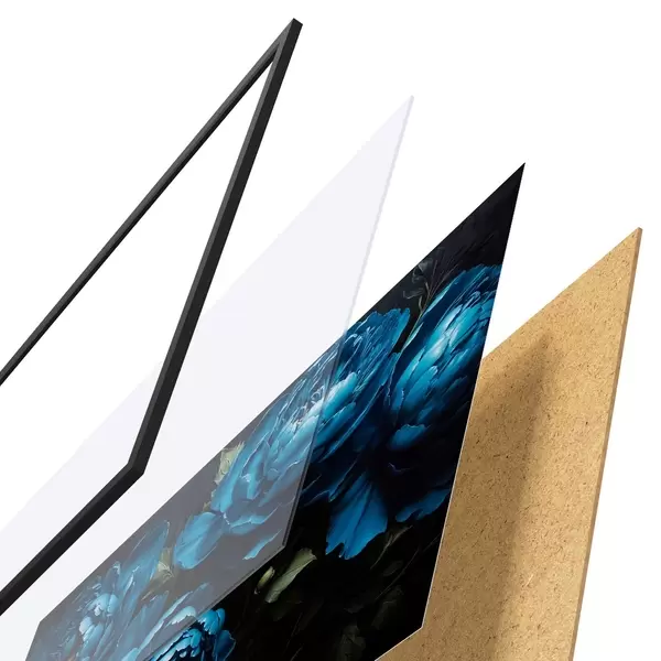 Das Poster besteht aus einem Rahmen, Plexiglas, einem gedruckten Bild und einer Rückwand aus Spanplatten. Dank der Halterungen auf der Rückseite kann das Poster sofort an die Wand gehängt werden.