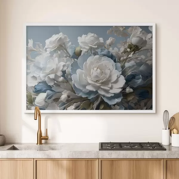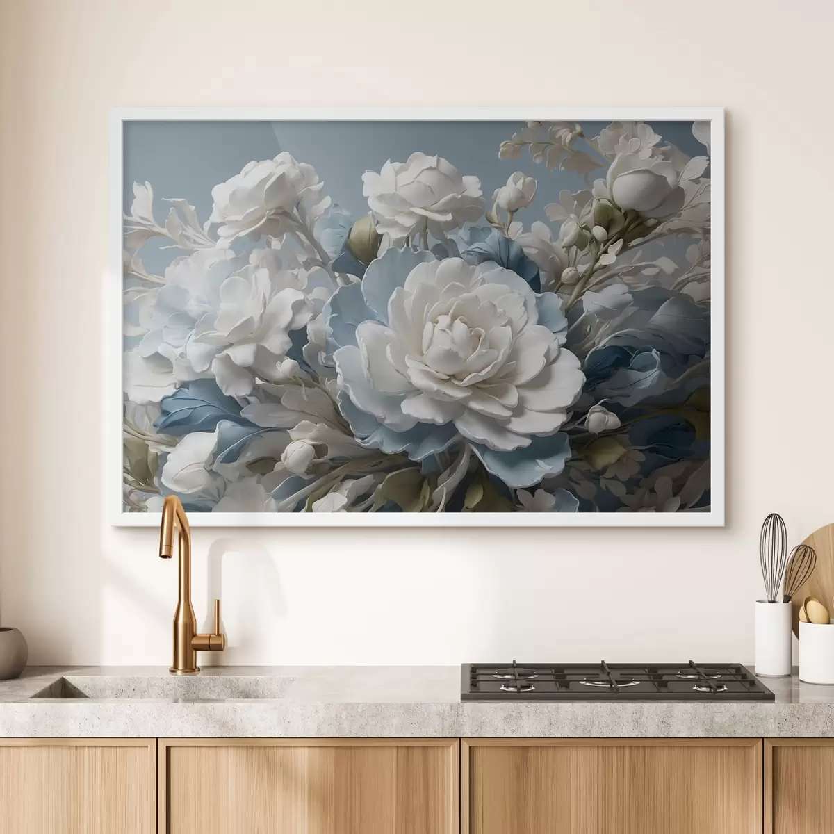 Poster Weiße Blumen und Blätter auf blauem Hintergrund Nr f41527