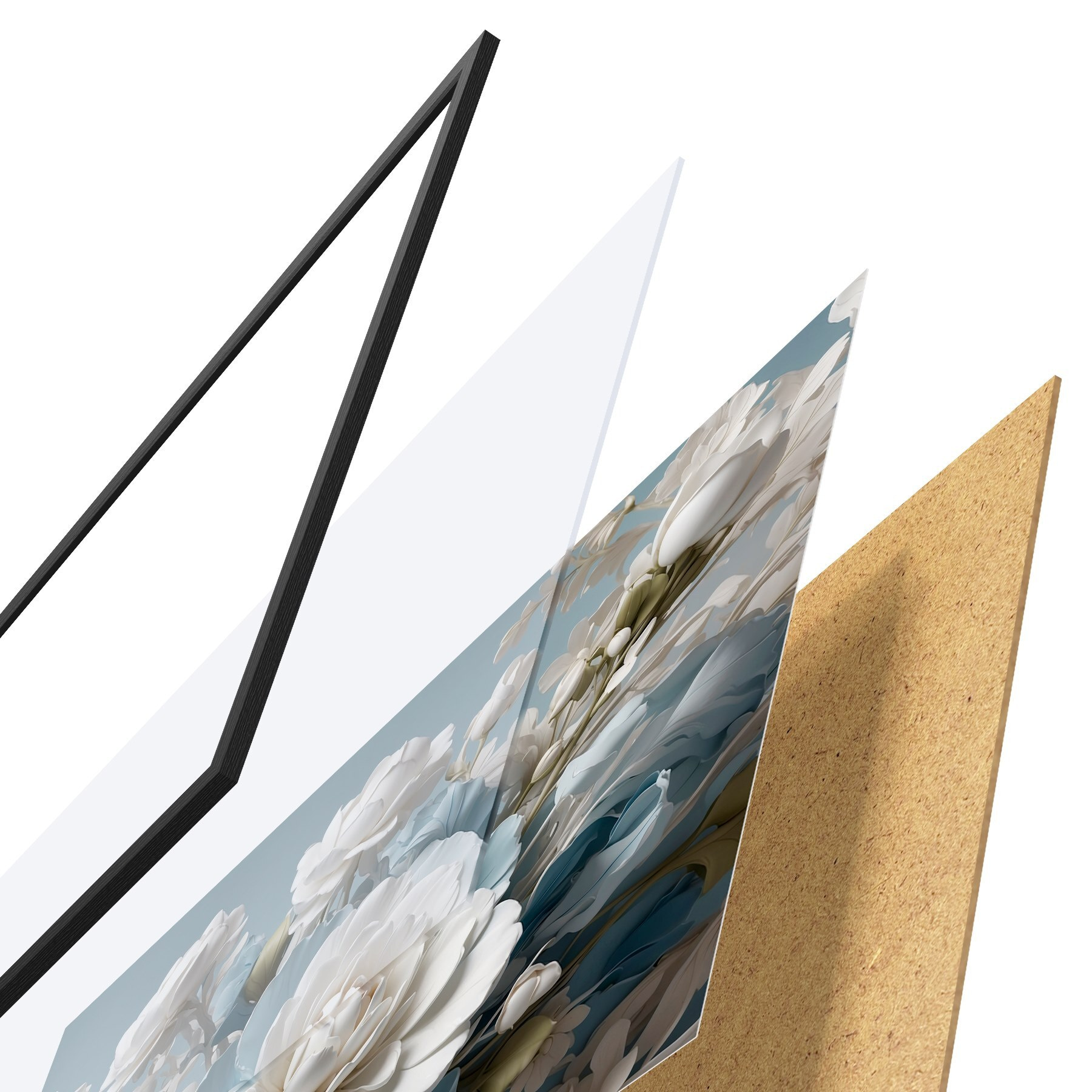 Das Poster besteht aus einem Rahmen, Plexiglas, einem gedruckten Bild und einer Rückwand aus Spanplatten. Dank der Halterungen auf der Rückseite kann das Poster sofort an die Wand gehängt werden.