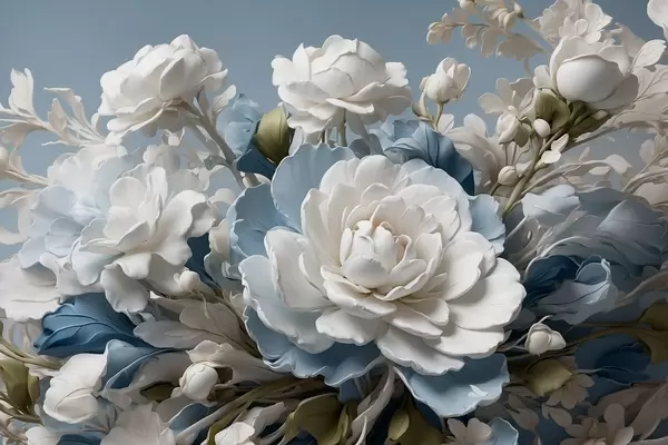 Poster Weiße Blumen und Blätter auf blauem Hintergrund Nr f41527