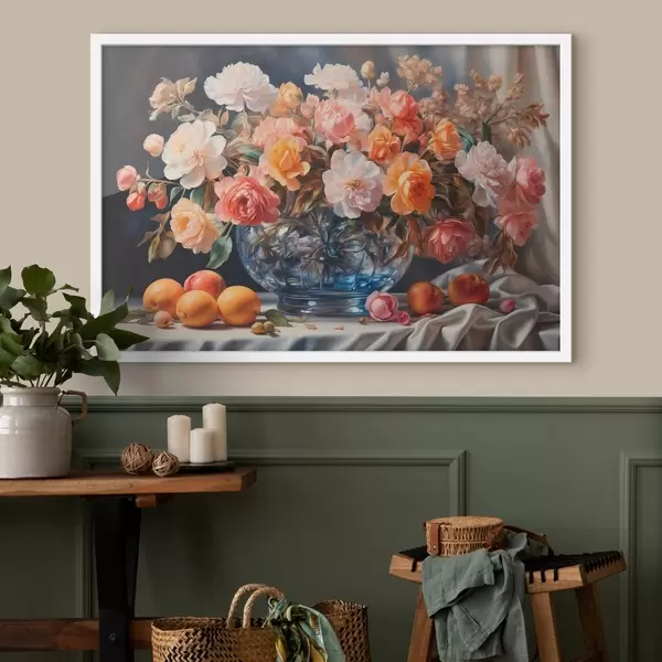 Poster Blumenstrauß in einer transparenten Vase auf einem Tisch f41533