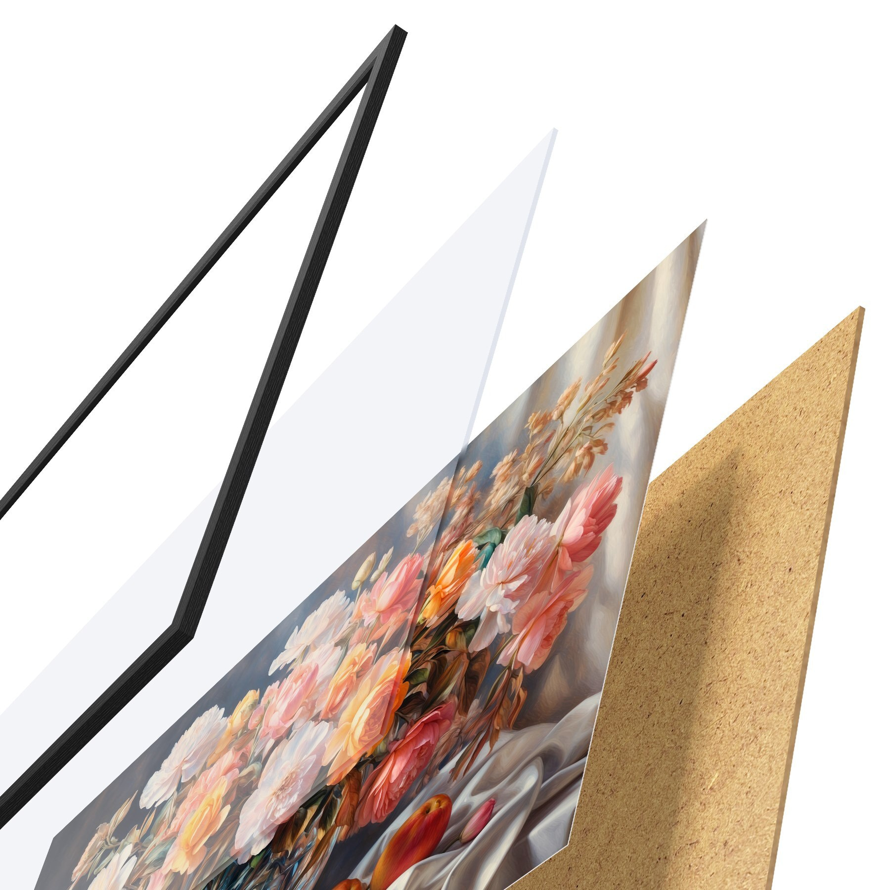 Das Poster besteht aus einem Rahmen, Plexiglas, einem gedruckten Bild und einer Rückwand aus Spanplatten. Dank der Halterungen auf der Rückseite kann das Poster sofort an die Wand gehängt werden.