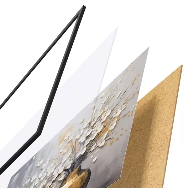 Das Poster besteht aus einem Rahmen, Plexiglas, einem gedruckten Bild und einer Rückwand aus Spanplatten. Dank der Halterungen auf der Rückseite kann das Poster sofort an die Wand gehängt werden.