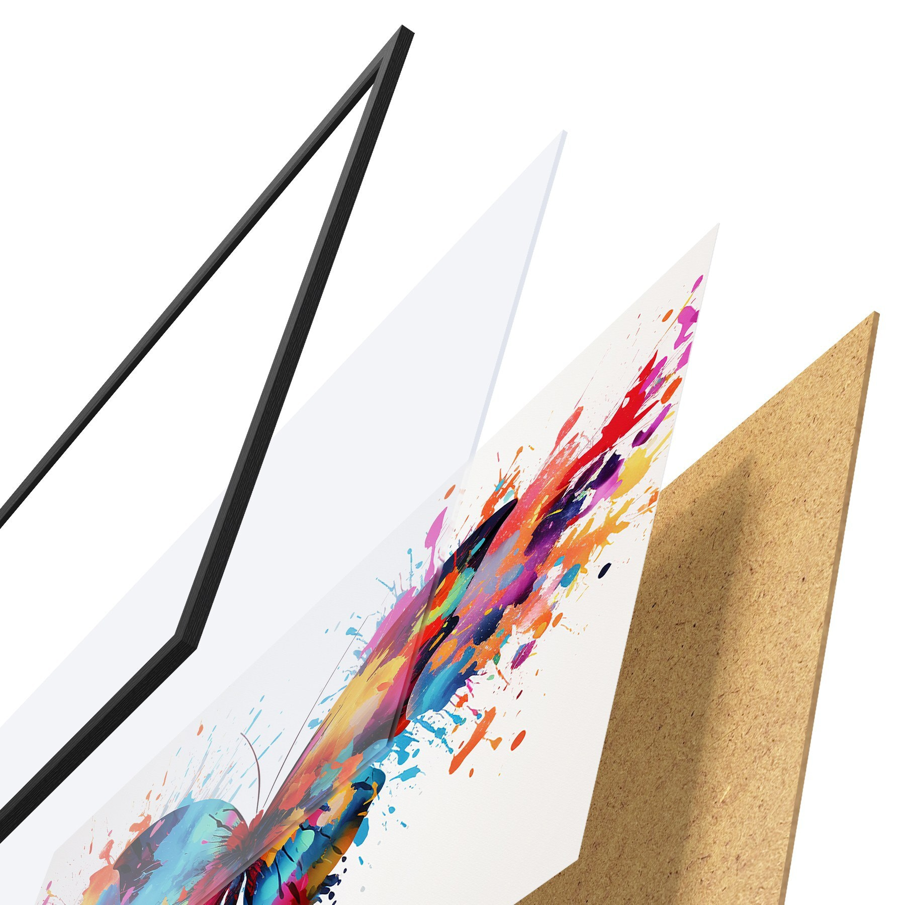 Das Poster besteht aus einem Rahmen, Plexiglas, einem gedruckten Bild und einer Rückwand aus Spanplatten. Dank der Halterungen auf der Rückseite kann das Poster sofort an die Wand gehängt werden.