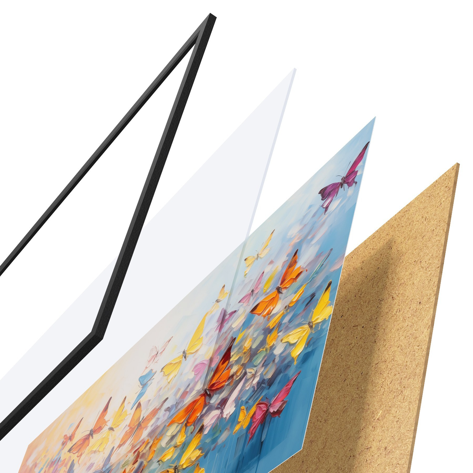 Das Poster besteht aus einem Rahmen, Plexiglas, einem gedruckten Bild und einer Rückwand aus Spanplatten. Dank der Halterungen auf der Rückseite kann das Poster sofort an die Wand gehängt werden.