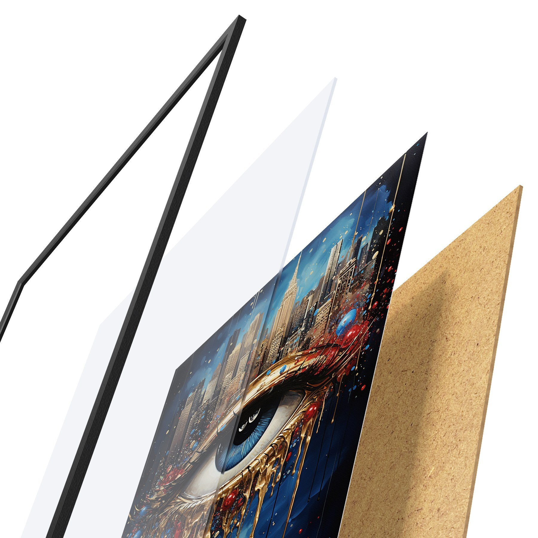 Das Poster besteht aus einem Rahmen, Plexiglas, einem gedruckten Bild und einer Rückwand aus Spanplatten. Dank der Halterungen auf der Rückseite kann das Poster sofort an die Wand gehängt werden.