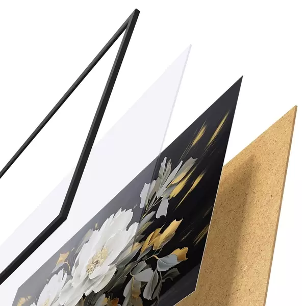 Das Poster besteht aus einem Rahmen, Plexiglas, einem gedruckten Bild und einer Rückwand aus Spanplatten. Dank der Halterungen auf der Rückseite kann das Poster sofort an die Wand gehängt werden.