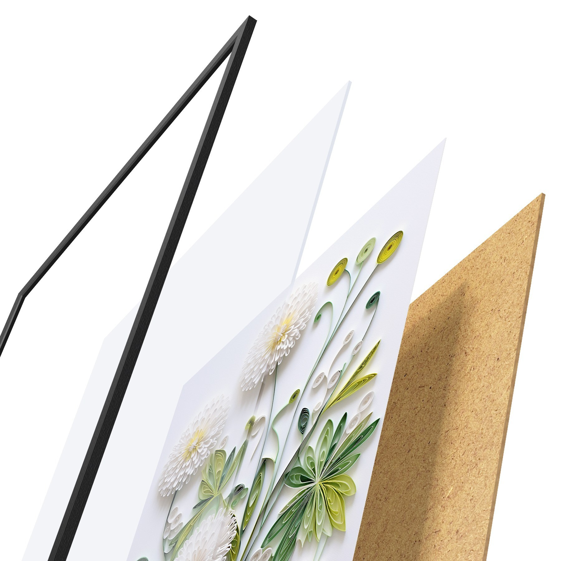 Das Poster besteht aus einem Rahmen, Plexiglas, einem gedruckten Bild und einer Rückwand aus Spanplatten. Dank der Halterungen auf der Rückseite kann das Poster sofort an die Wand gehängt werden.