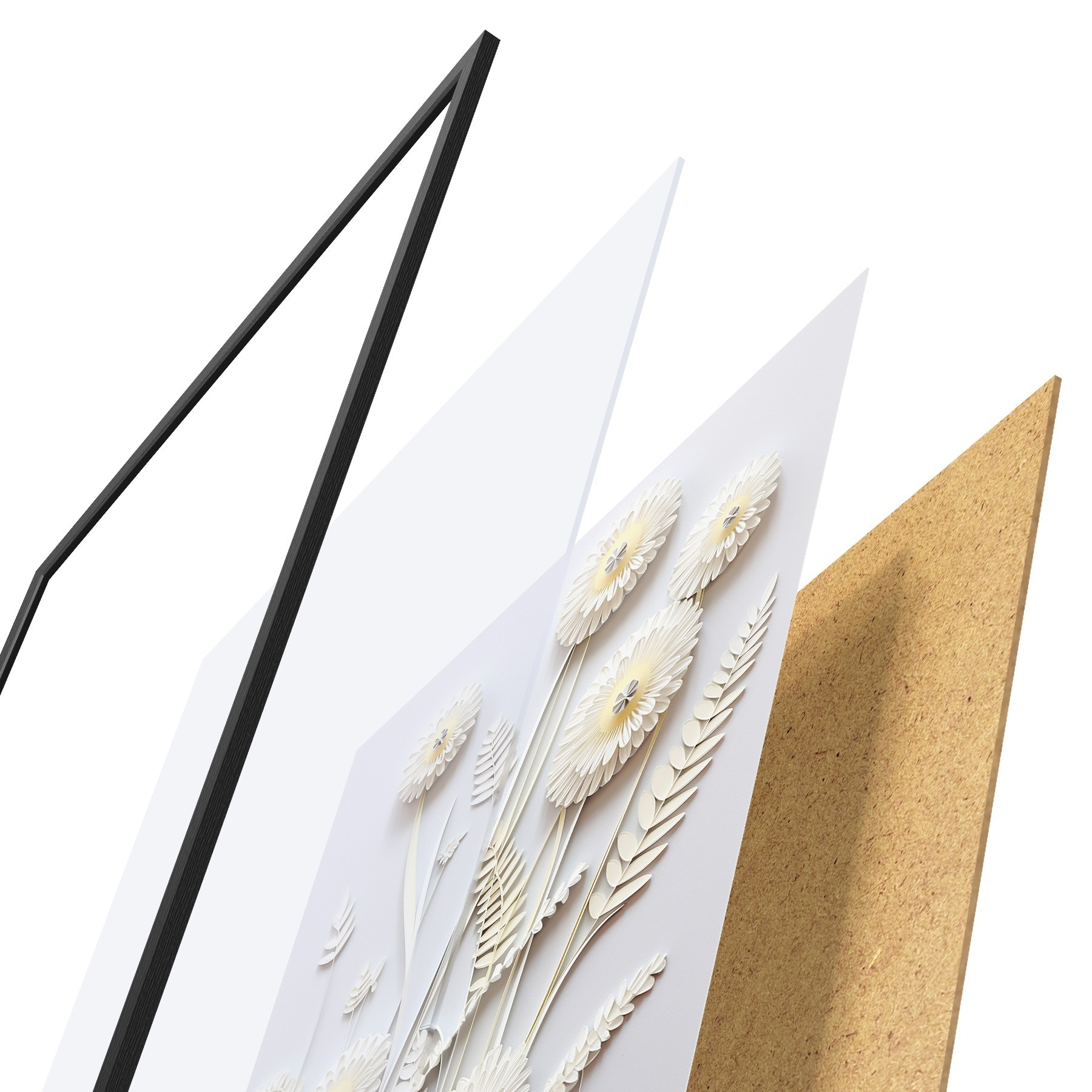 Das Poster besteht aus einem Rahmen, Plexiglas, einem gedruckten Bild und einer Rückwand aus Spanplatten. Dank der Halterungen auf der Rückseite kann das Poster sofort an die Wand gehängt werden.