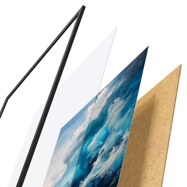 Das Poster besteht aus einem Rahmen, Plexiglas, einem gedruckten Bild und einer Rückwand aus Spanplatten. Dank der Halterungen auf der Rückseite kann das Poster sofort an die Wand gehängt werden.