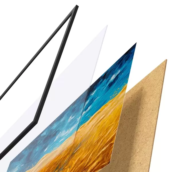 Das Poster besteht aus einem Rahmen, Plexiglas, einem gedruckten Bild und einer Rückwand aus Spanplatten. Dank der Halterungen auf der Rückseite kann das Poster sofort an die Wand gehängt werden.
