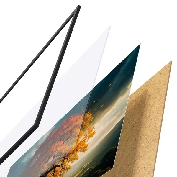 Das Poster besteht aus einem Rahmen, Plexiglas, einem gedruckten Bild und einer Rückwand aus Spanplatten. Dank der Halterungen auf der Rückseite kann das Poster sofort an die Wand gehängt werden.