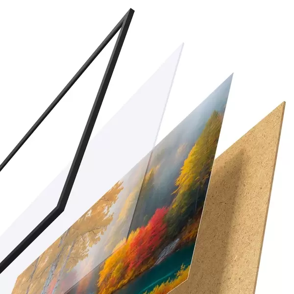 Das Poster besteht aus einem Rahmen, Plexiglas, einem gedruckten Bild und einer Rückwand aus Spanplatten. Dank der Halterungen auf der Rückseite kann das Poster sofort an die Wand gehängt werden.