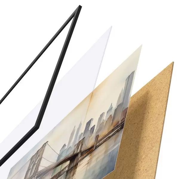 Das Poster besteht aus einem Rahmen, Plexiglas, einem gedruckten Bild und einer Rückwand aus Spanplatten. Dank der Halterungen auf der Rückseite kann das Poster sofort an die Wand gehängt werden.