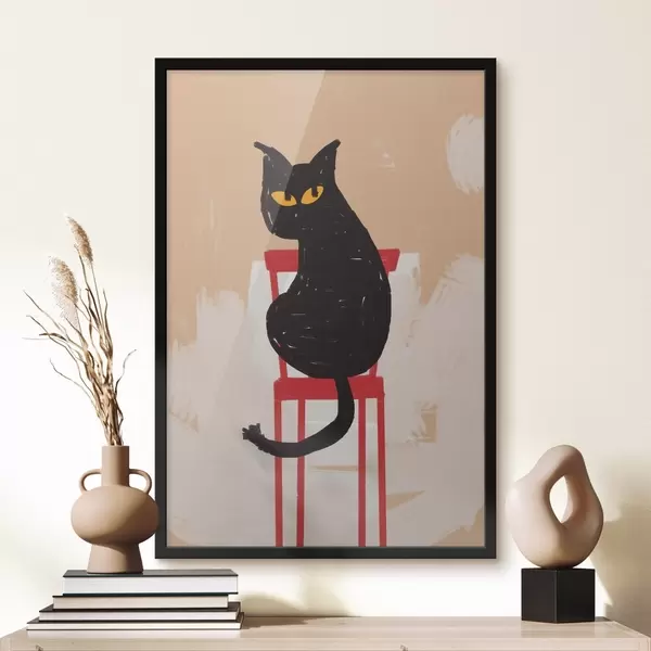 Poster Schwarze Katze sitzt auf rotem Stuhl auf beigem Hintergrund, grobe Striche, Nachahmung der Malerei f41612