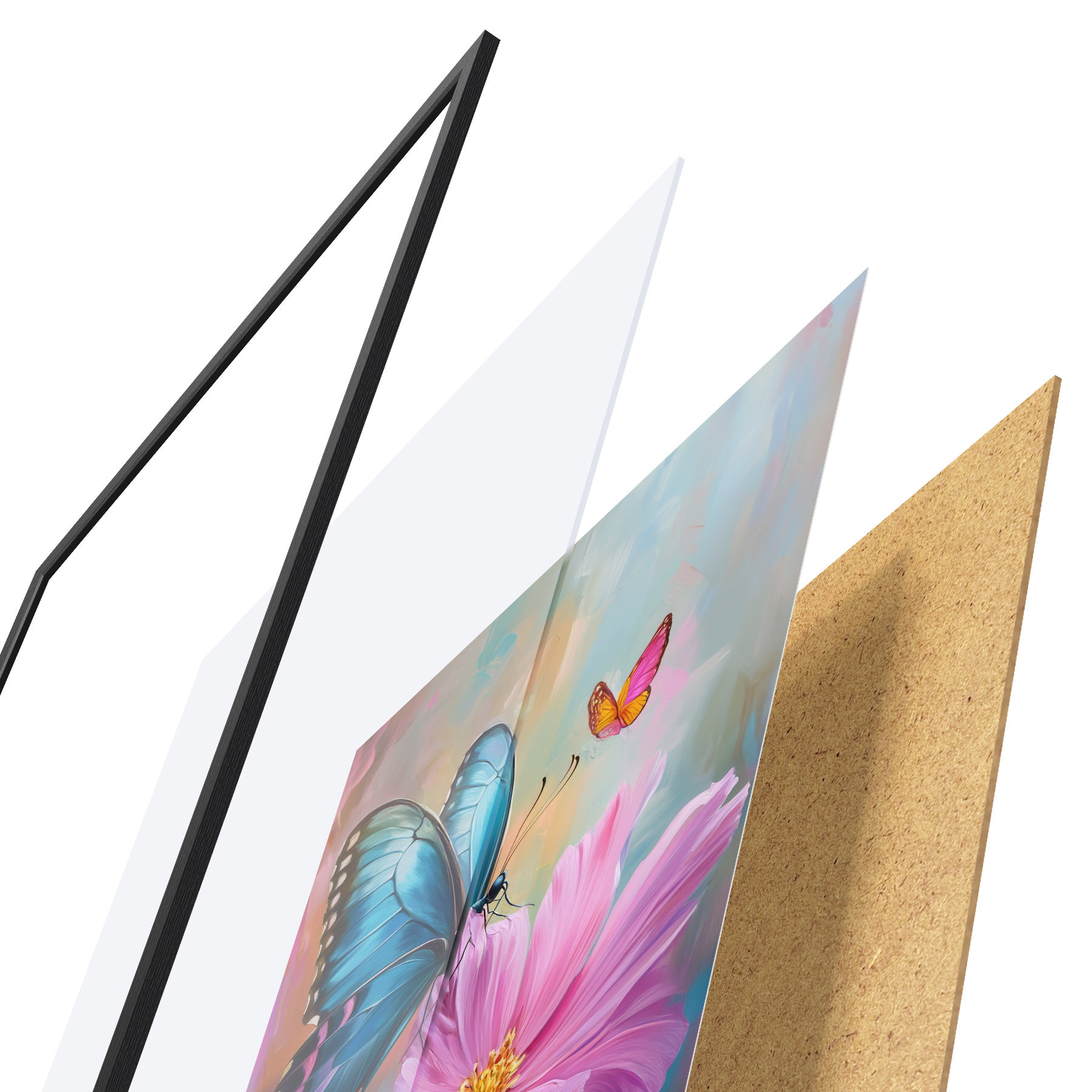 Das Poster besteht aus einem Rahmen, Plexiglas, einem gedruckten Bild und einer Rückwand aus Spanplatten. Dank der Halterungen auf der Rückseite kann das Poster sofort an die Wand gehängt werden.
