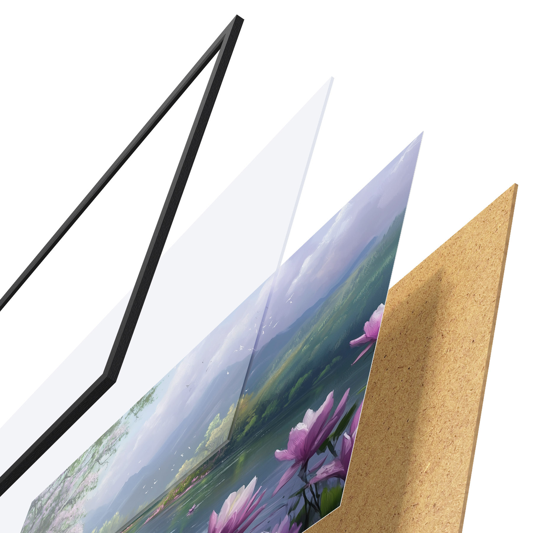 Das Poster besteht aus einem Rahmen, Plexiglas, einem gedruckten Bild und einer Rückwand aus Spanplatten. Dank der Halterungen auf der Rückseite kann das Poster sofort an die Wand gehängt werden.