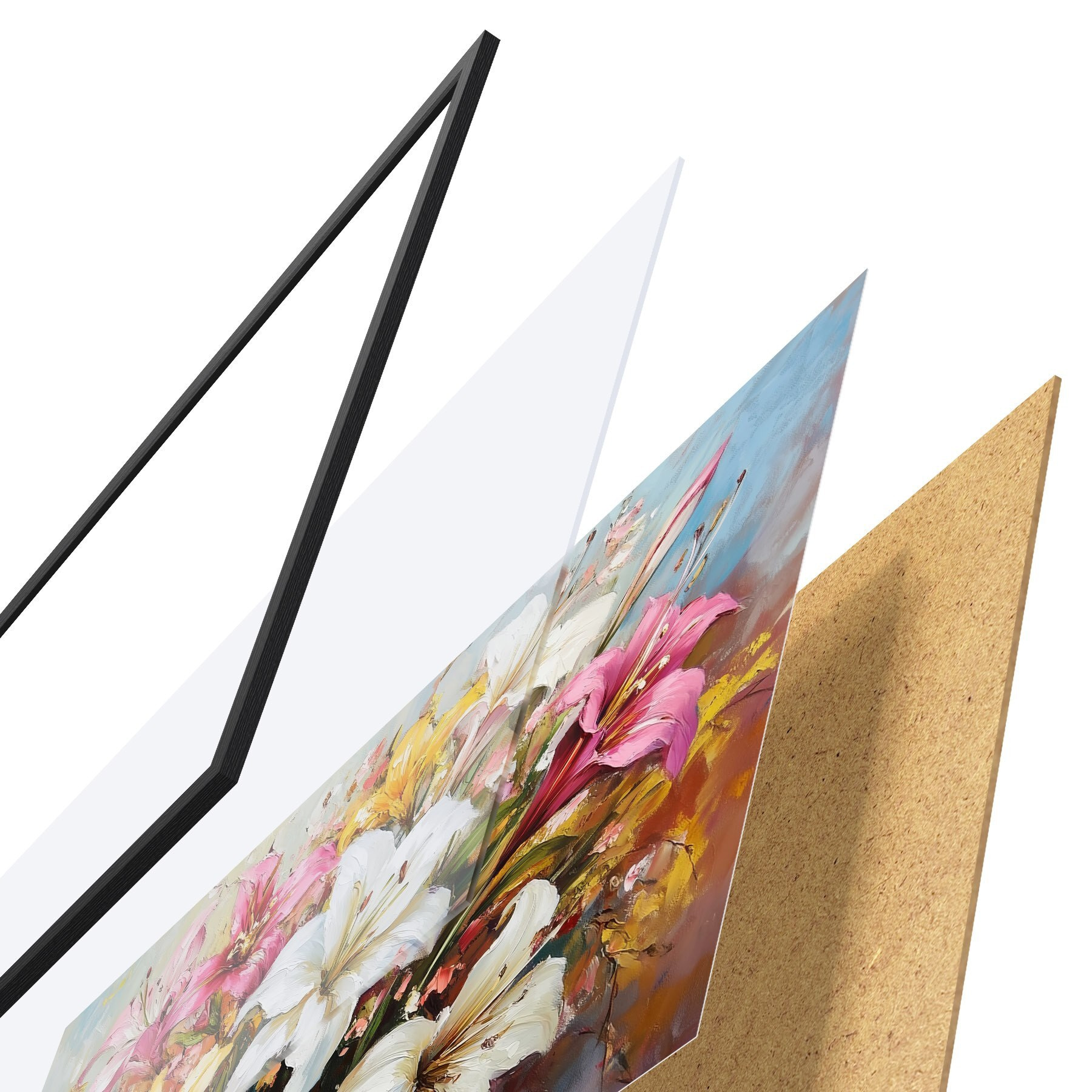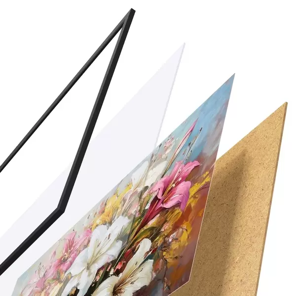 Das Poster besteht aus einem Rahmen, Plexiglas, einem gedruckten Bild und einer Rückwand aus Spanplatten. Dank der Halterungen auf der Rückseite kann das Poster sofort an die Wand gehängt werden.