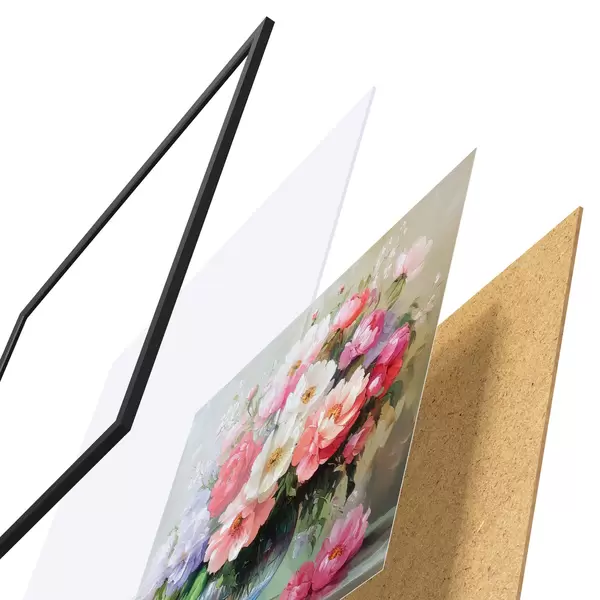 Das Poster besteht aus einem Rahmen, Plexiglas, einem gedruckten Bild und einer Rückwand aus Spanplatten. Dank der Halterungen auf der Rückseite kann das Poster sofort an die Wand gehängt werden.
