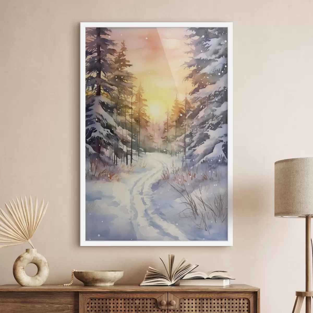 Poster Aquarell Winterwald, Schneeflocken, schöner Himmel, Sonnenuntergang Nr f41640