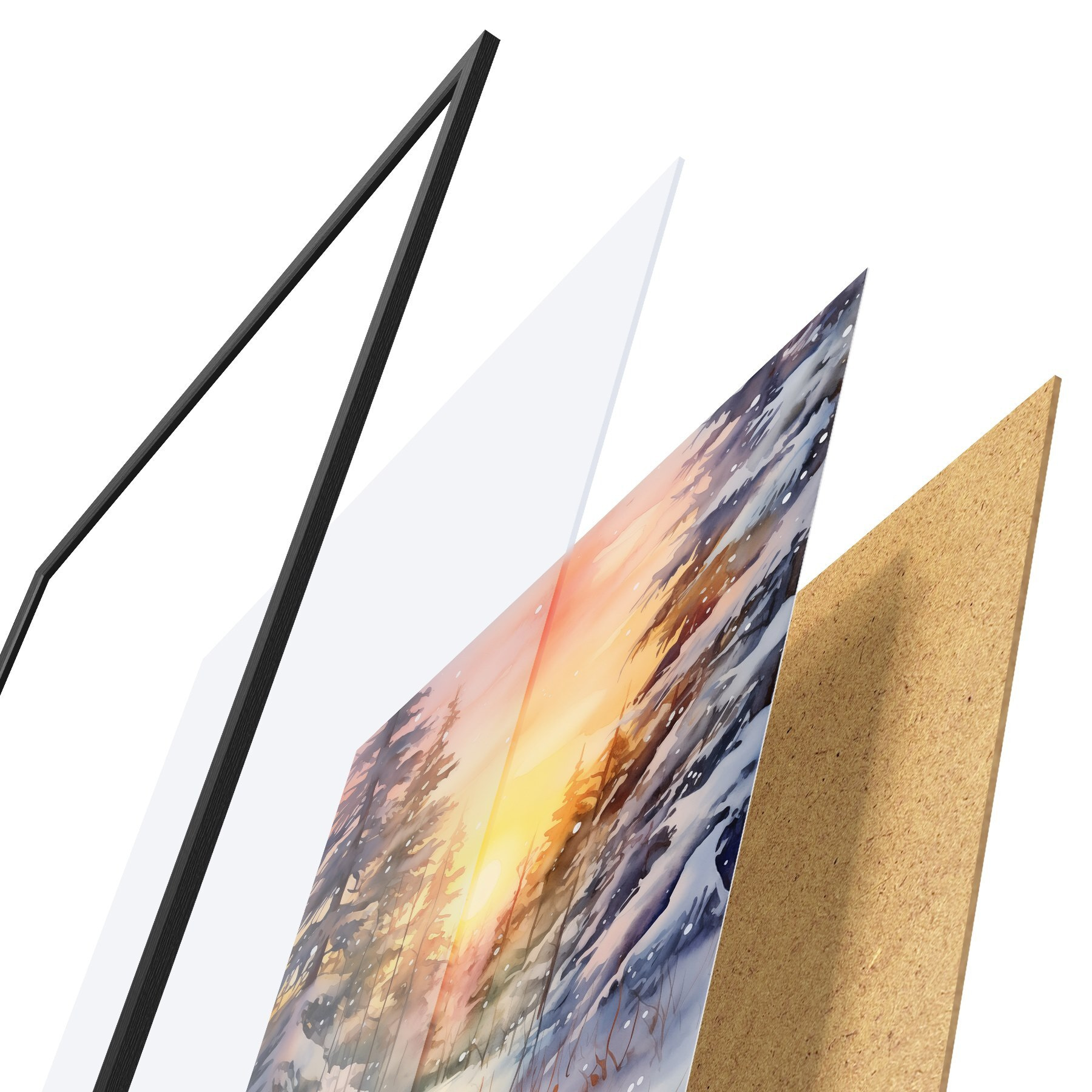 Das Poster besteht aus einem Rahmen, Plexiglas, einem gedruckten Bild und einer Rückwand aus Spanplatten. Dank der Halterungen auf der Rückseite kann das Poster sofort an die Wand gehängt werden.