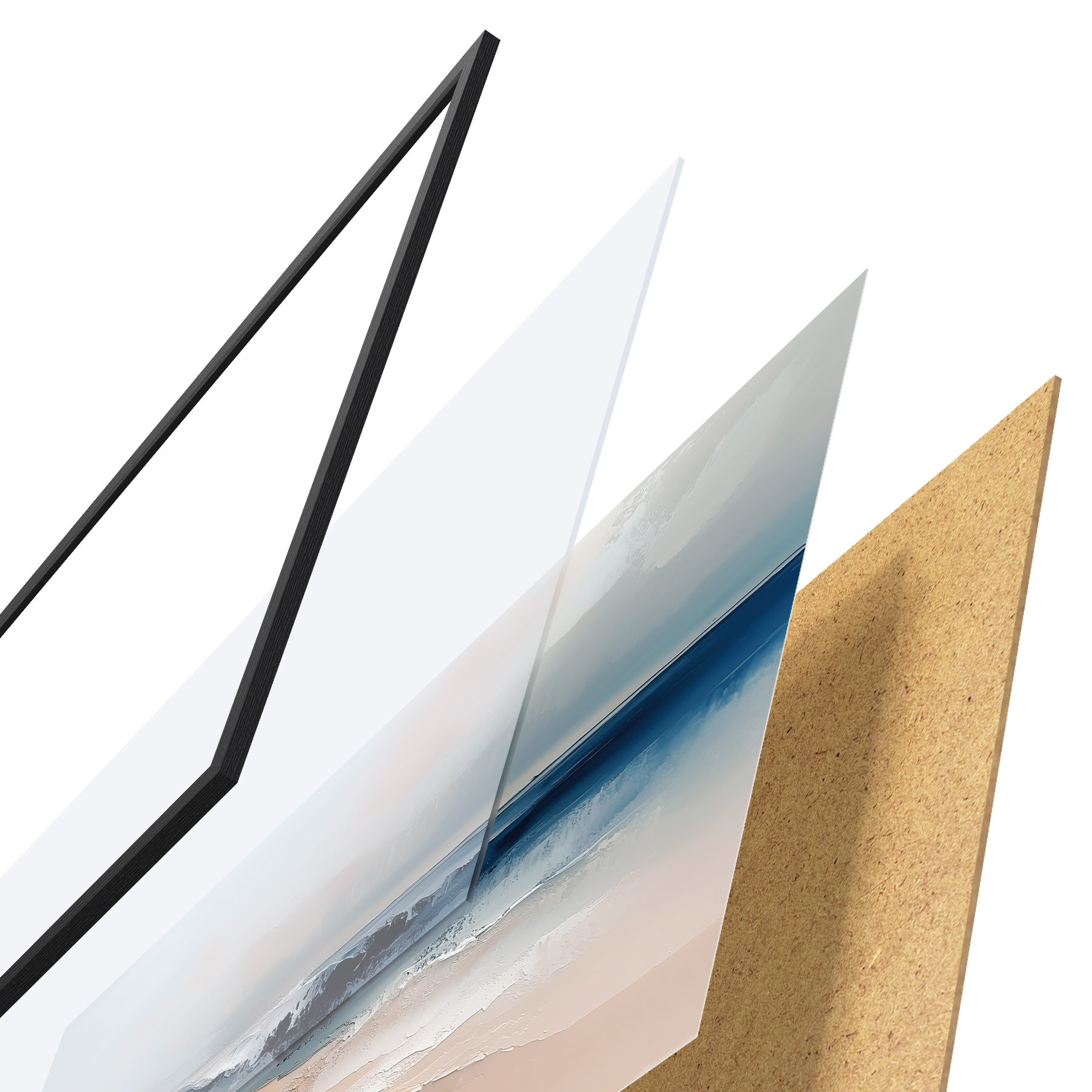 Das Poster besteht aus einem Rahmen, Plexiglas, einem gedruckten Bild und einer Rückwand aus Spanplatten. Dank der Halterungen auf der Rückseite kann das Poster sofort an die Wand gehängt werden.