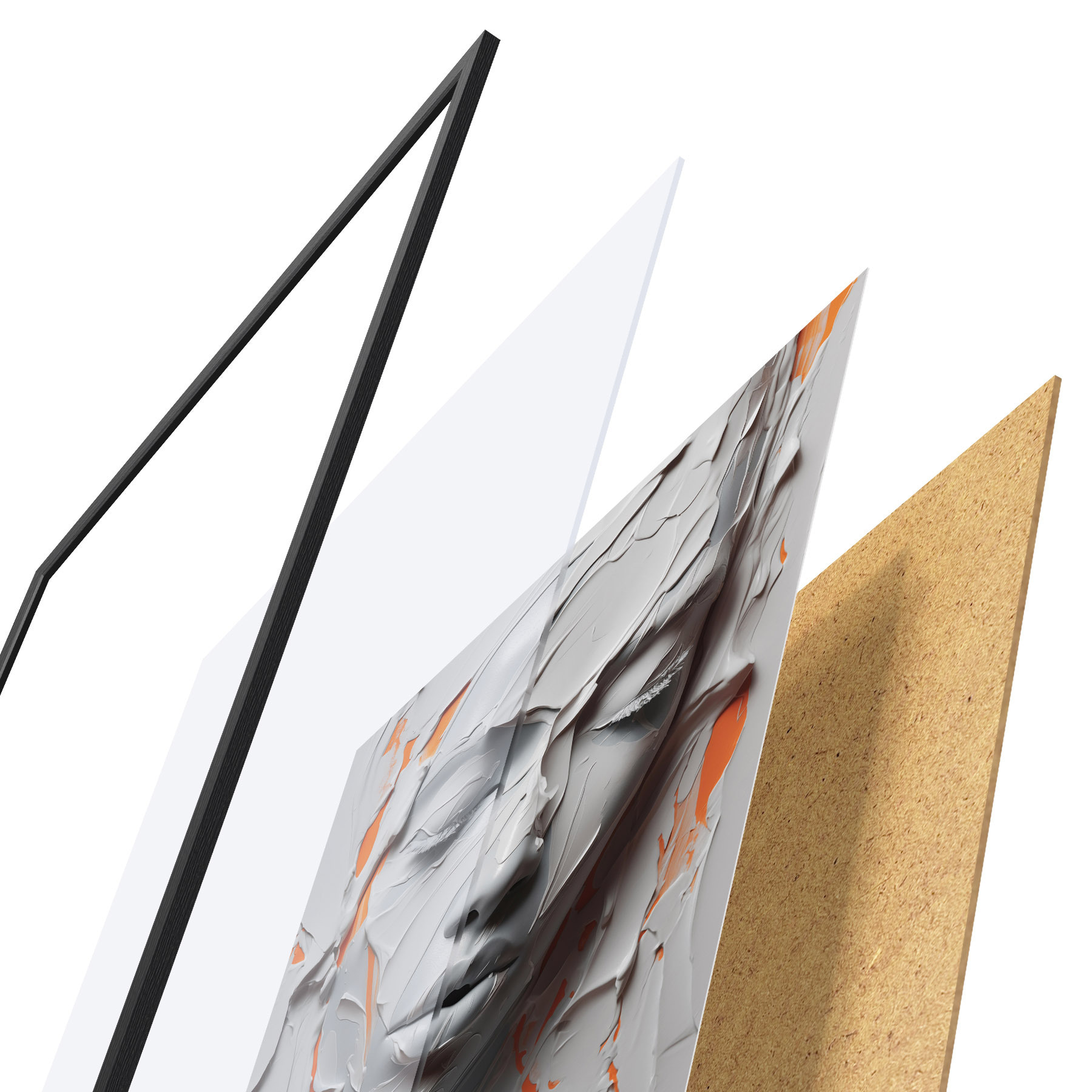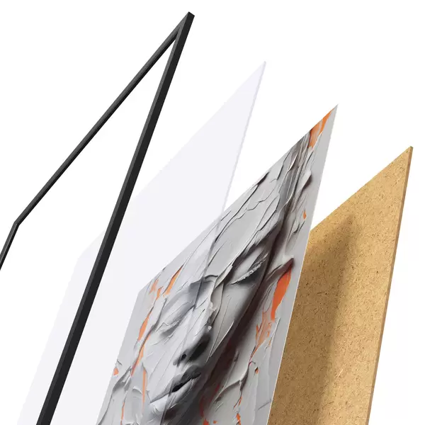 Das Poster besteht aus einem Rahmen, Plexiglas, einem gedruckten Bild und einer Rückwand aus Spanplatten. Dank der Halterungen auf der Rückseite kann das Poster sofort an die Wand gehängt werden.