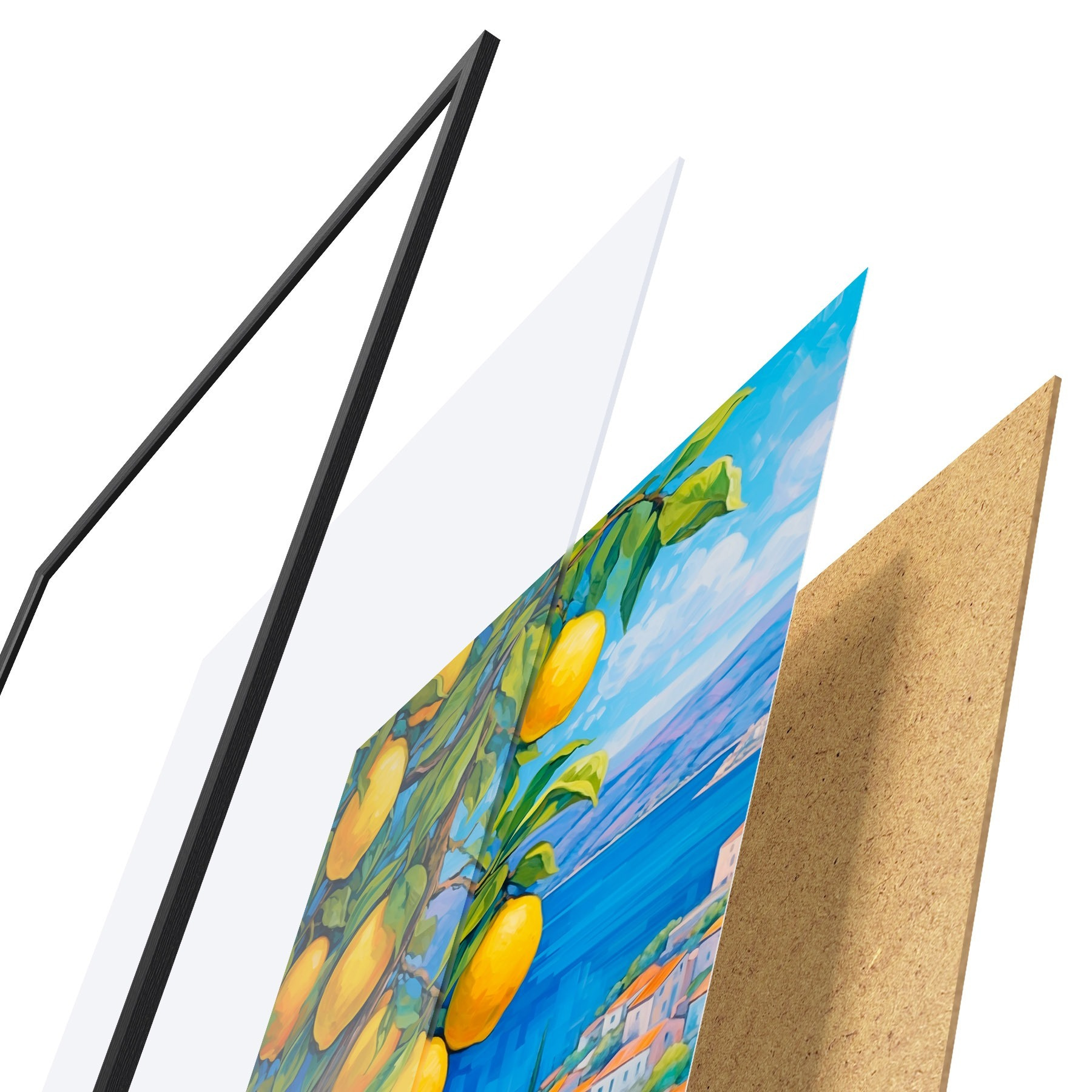 Das Poster besteht aus einem Rahmen, Plexiglas, einem gedruckten Bild und einer Rückwand aus Spanplatten. Dank der Halterungen auf der Rückseite kann das Poster sofort an die Wand gehängt werden.