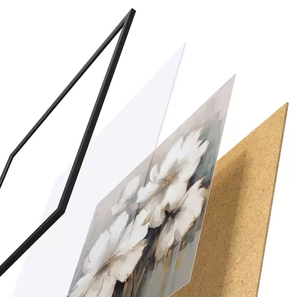 Das Poster besteht aus einem Rahmen, Plexiglas, einem gedruckten Bild und einer Rückwand aus Spanplatten. Dank der Halterungen auf der Rückseite kann das Poster sofort an die Wand gehängt werden.