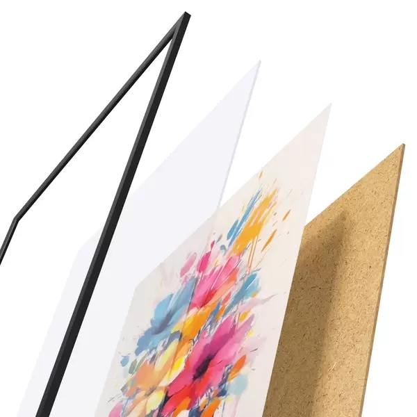 Das Poster besteht aus einem Rahmen, Plexiglas, einem gedruckten Bild und einer Rückwand aus Spanplatten. Dank der Halterungen auf der Rückseite kann das Poster sofort an die Wand gehängt werden.