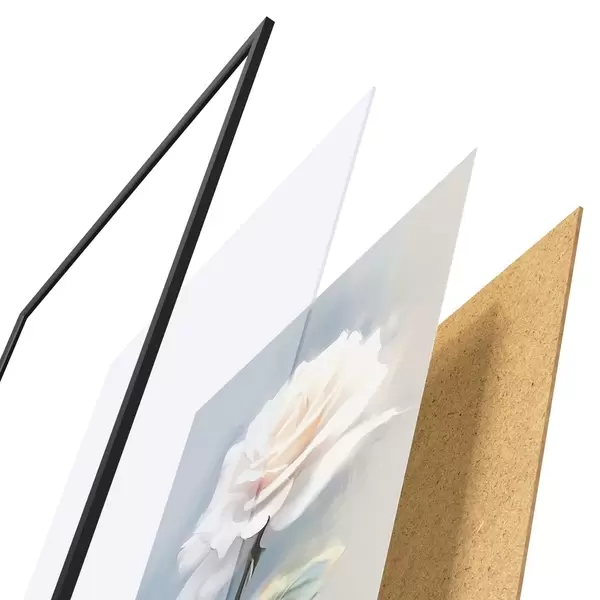 Das Poster besteht aus einem Rahmen, Plexiglas, einem gedruckten Bild und einer Rückwand aus Spanplatten. Dank der Halterungen auf der Rückseite kann das Poster sofort an die Wand gehängt werden.