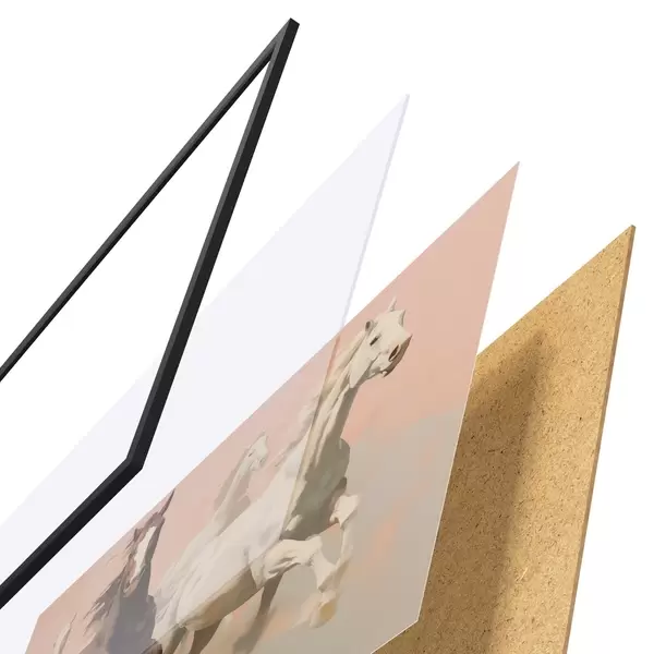 Das Poster besteht aus einem Rahmen, Plexiglas, einem gedruckten Bild und einer Rückwand aus Spanplatten. Dank der Halterungen auf der Rückseite kann das Poster sofort an die Wand gehängt werden.