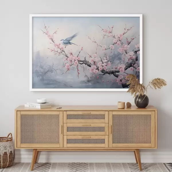 Poster Blauer Vogel fliegt zwischen rosa Kirschblütenblüten auf einem nebligen Frühling gedämpften Hintergrund f41712