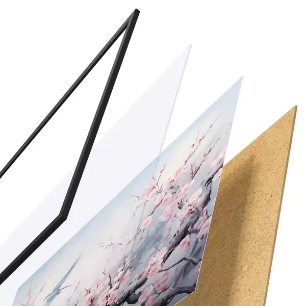 Das Poster besteht aus einem Rahmen, Plexiglas, einem gedruckten Bild und einer Rückwand aus Spanplatten. Dank der Halterungen auf der Rückseite kann das Poster sofort an die Wand gehängt werden.