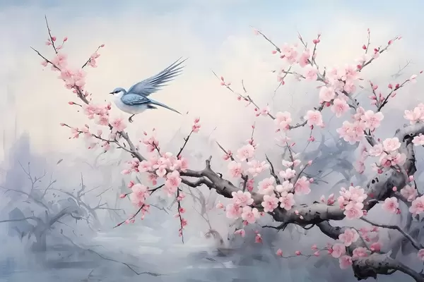 Poster Blauer Vogel fliegt zwischen rosa Kirschblütenblüten auf einem nebligen Frühling gedämpften Hintergrund f41712
