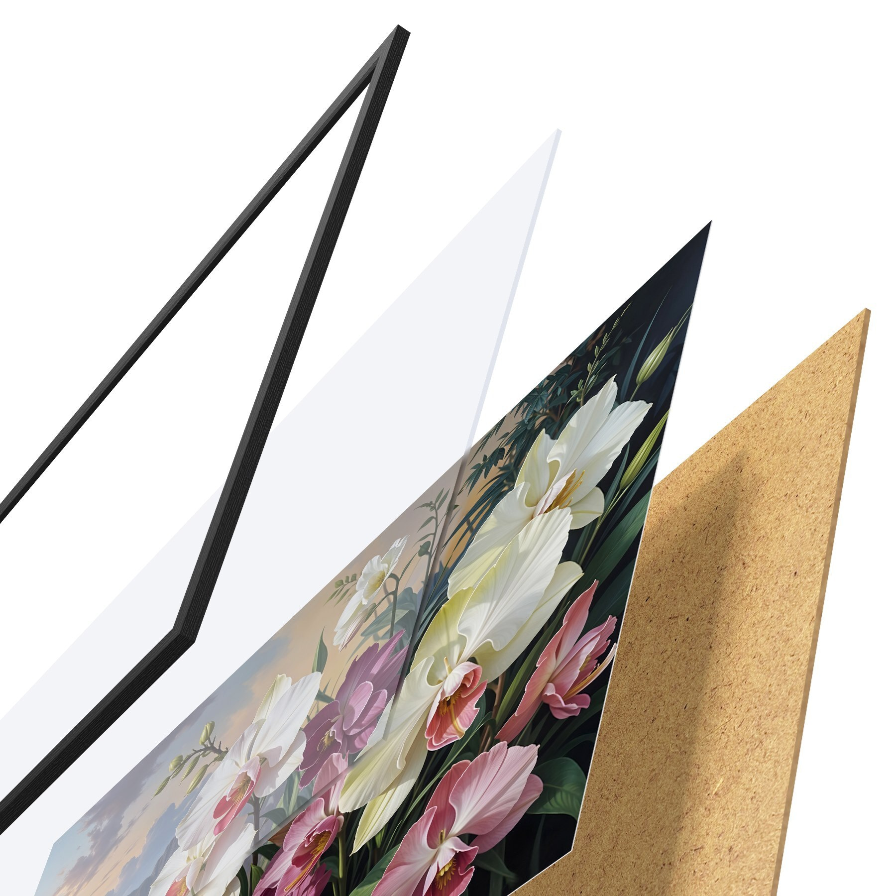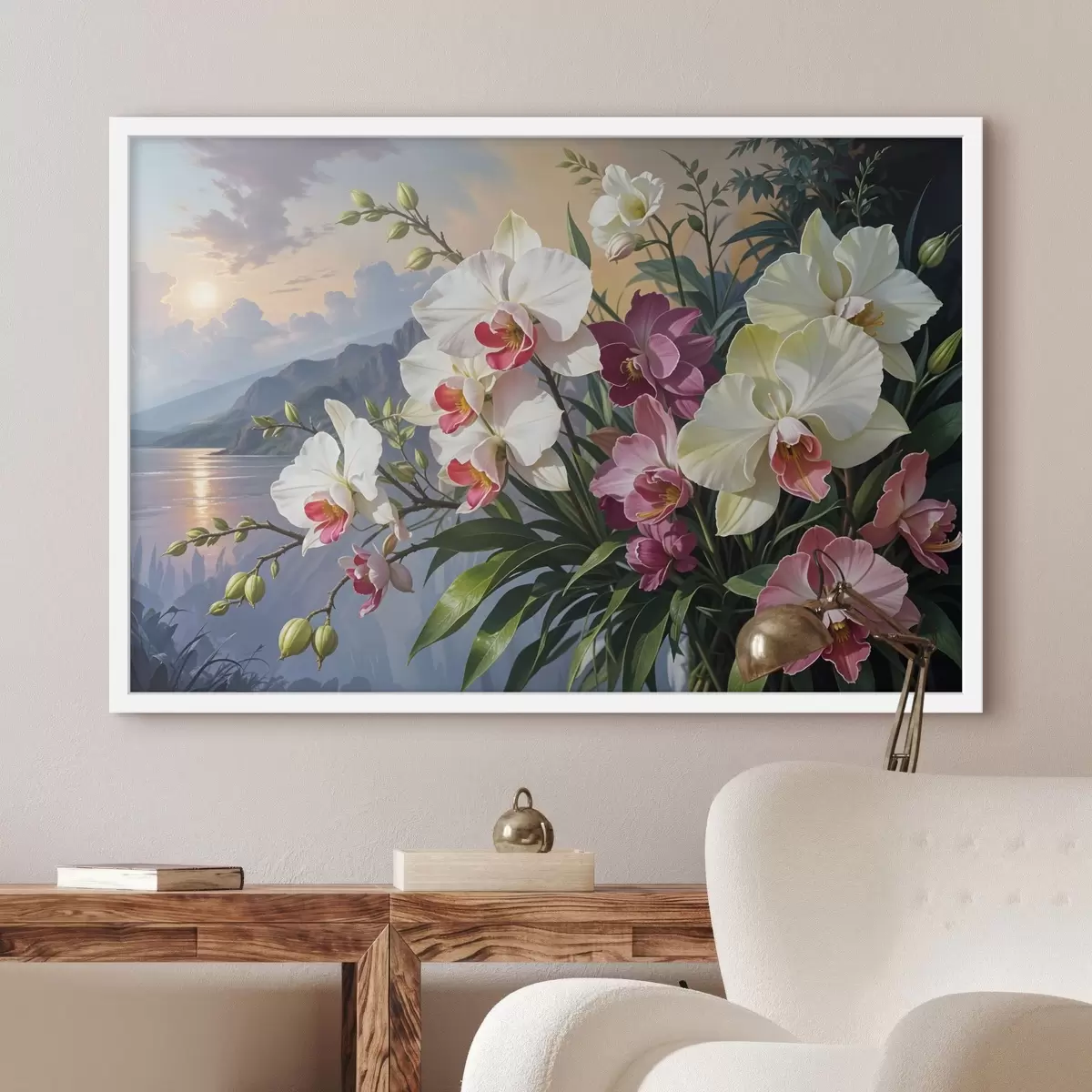 Poster Ein lebendiger Strauß tropischer Blumen mit Orchideen und üppigem grünem Laub vor dem Hintergrund einer Meereslandschaft Nr f41713