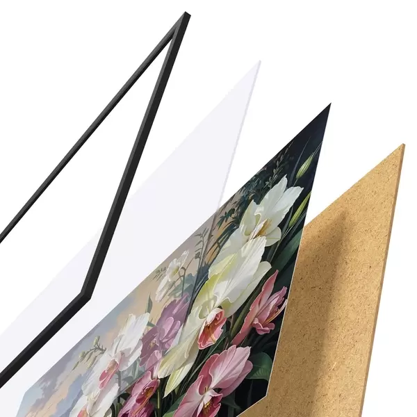 Das Poster besteht aus einem Rahmen, Plexiglas, einem gedruckten Bild und einer Rückwand aus Spanplatten. Dank der Halterungen auf der Rückseite kann das Poster sofort an die Wand gehängt werden.