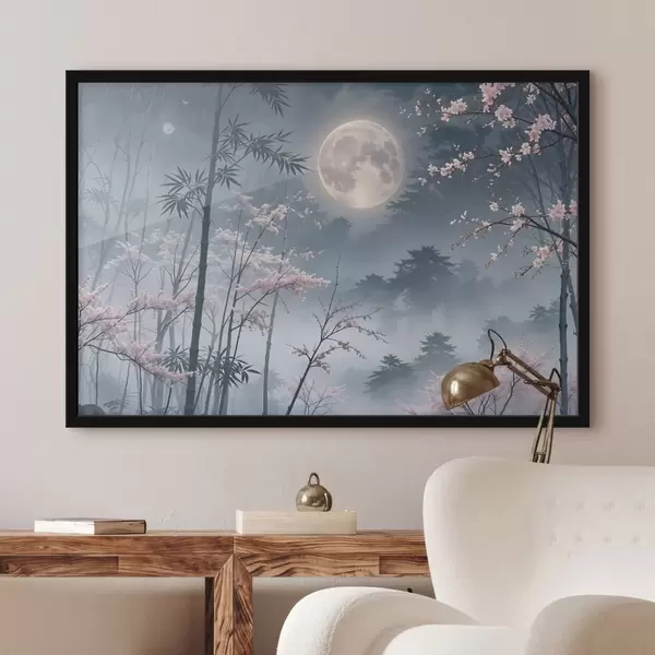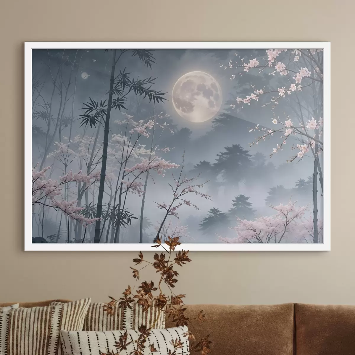 Poster Ein Vollmond am Nachthimmel, umgeben von Bambussilhouetten und Kirschblütenzweigen Nr f41717